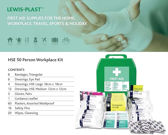 The Lewis-Plast Large HSE 21-50 Persons First Aid Kit contains all the essential safety items and accessories you need for minor injuries and emergencies